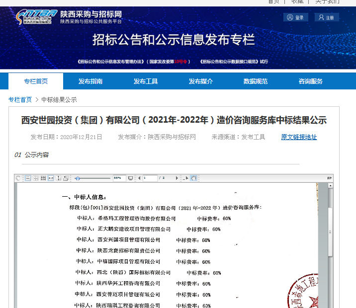 2020年12月,我公司參與“西安世園投資(集團(tuán))有限公司(2021年-2022年)造價咨詢服務(wù)庫”招標(biāo)項(xiàng)目,經(jīng)評審委員會綜合評審,招標(biāo)人確認(rèn),正大鵬安公司入圍該項(xiàng)目。