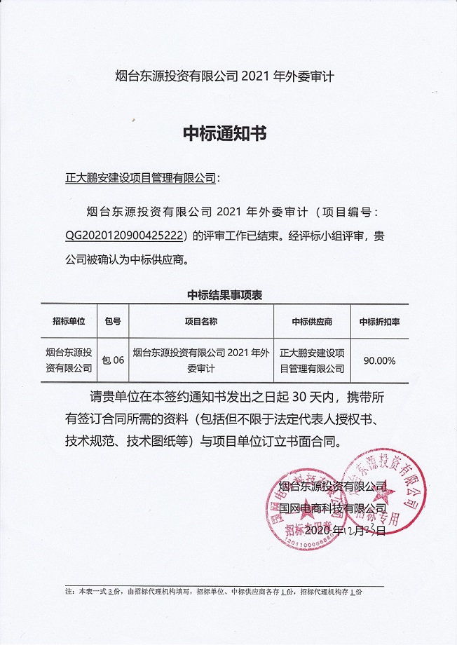 近日,我公司參與了“煙臺東源投資有限公司2021年外委審計(項(xiàng)目編號:QG2020120900425222)的招標(biāo)項(xiàng)目”經(jīng)評標(biāo)小組評審,招標(biāo)人確認(rèn),正大鵬安公司被確認(rèn)為中標(biāo)供應(yīng)商。