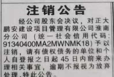 經(jīng)公司股東會決議,對正大鵬安建設(shè)項目管理有限公司安徽淮南分公司(統(tǒng)一社會信用代碼:91340400MA2MWNMK18)予以注銷,請有債權(quán)債務(wù)的單位和個人自登報之日起45日內(nèi)前來辦理相關(guān)事宜,逾期不報視為放棄處理,特此公告。