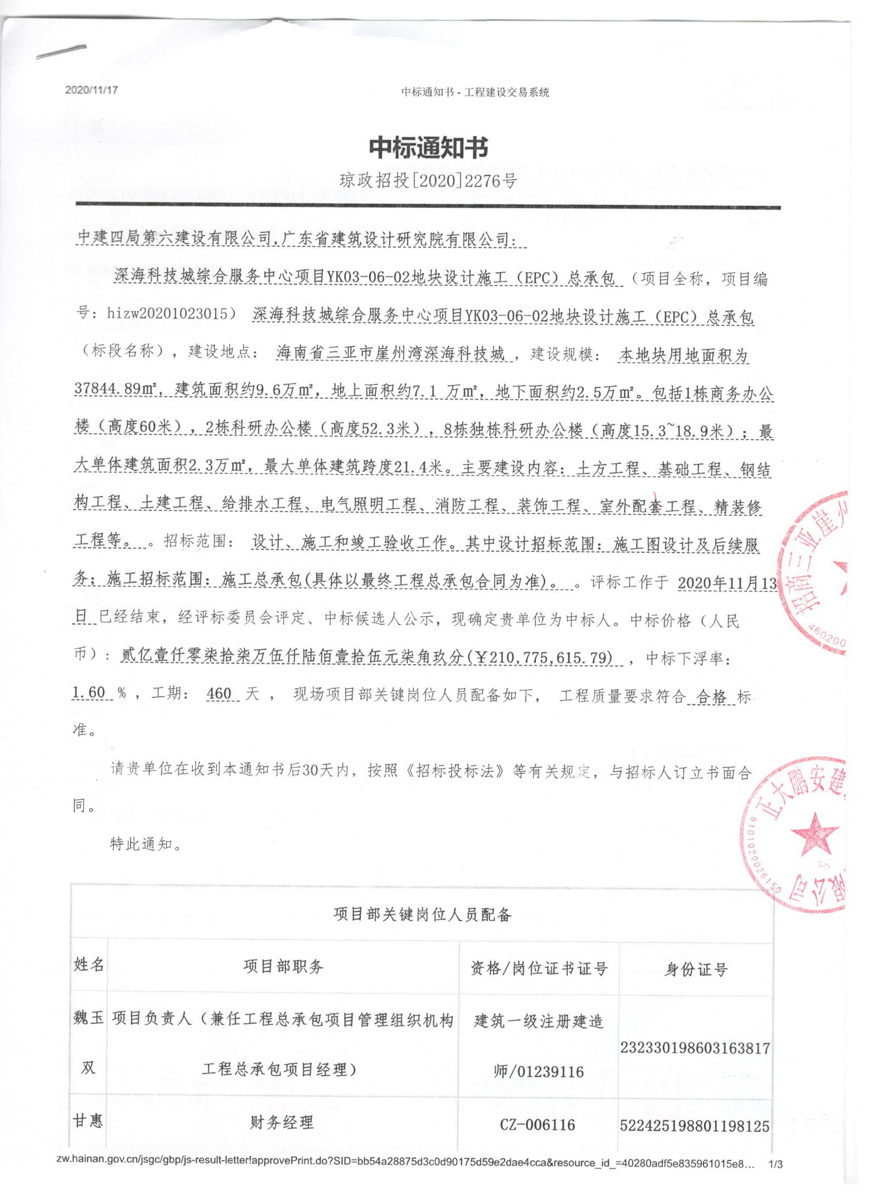 深海科技城綜合服務(wù)中心項目YK03-06-02地塊設(shè)計施工(EPC)總承包