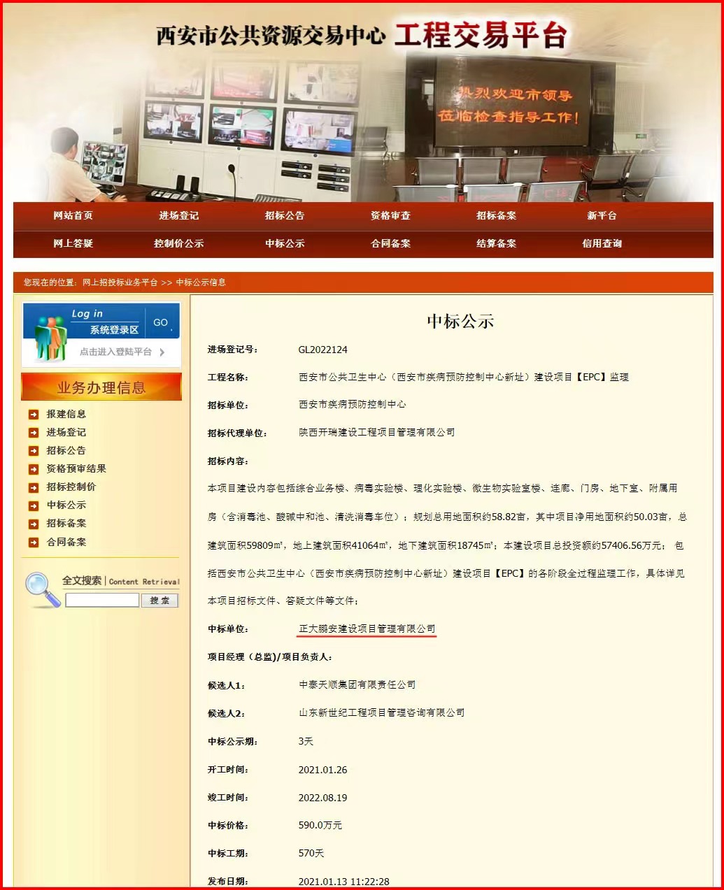 2021年1月,經(jīng)評標(biāo)委員會(huì)評定,招標(biāo)人確認(rèn),正大鵬安建設(shè)項(xiàng)目管理有限公司中標(biāo)西安市疾病預(yù)防控制中心的“西安市公共衛(wèi)生中心(西安市疾病預(yù)防 控制中心新址)建設(shè)項(xiàng)目【EPC】監(jiān)理
