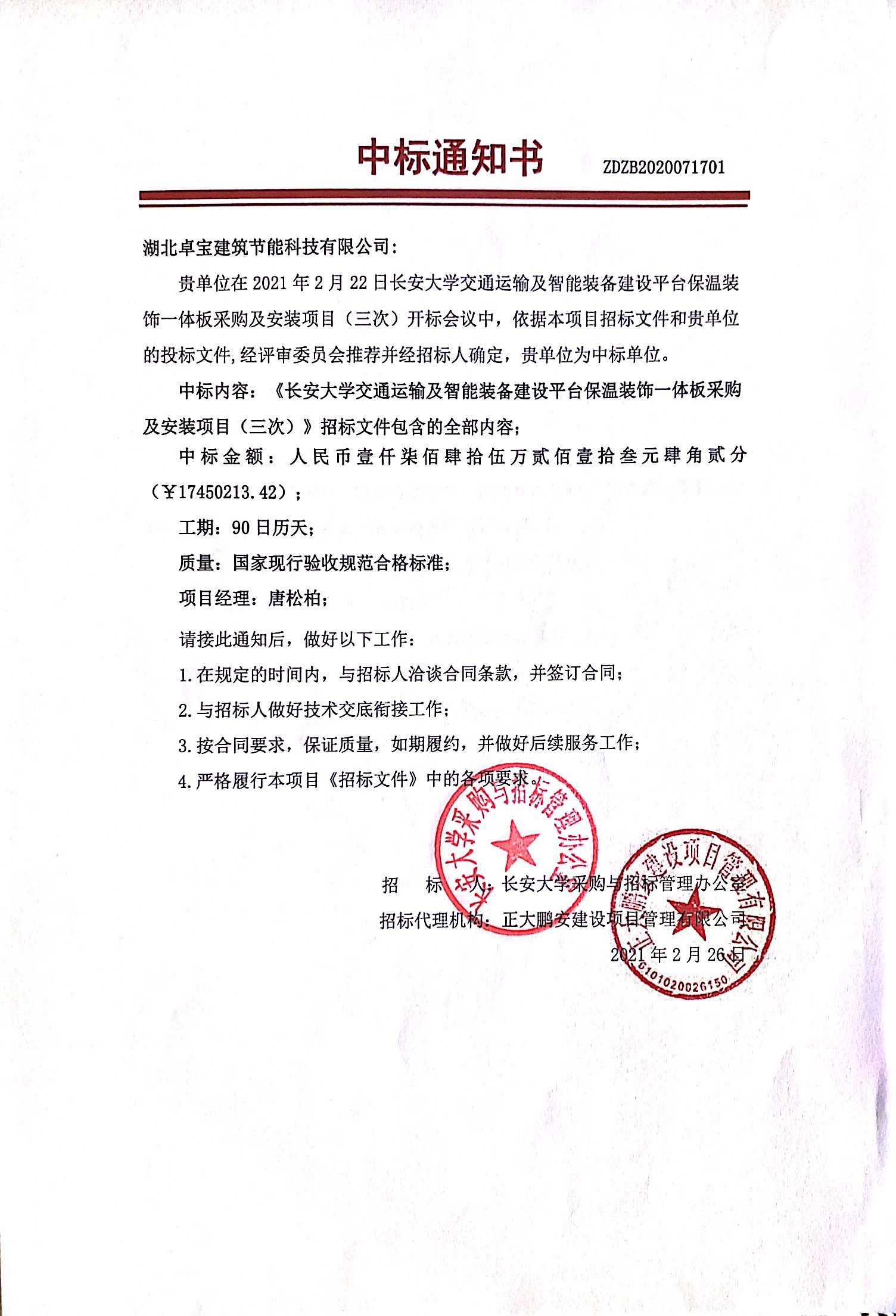 項目概況: 《長安大學交通運輸及智能裝備建設平臺保溫裝飾一體板采購及安裝項目(三次)》招標文件包含的全部內(nèi)容;,總投資1745.02萬元。