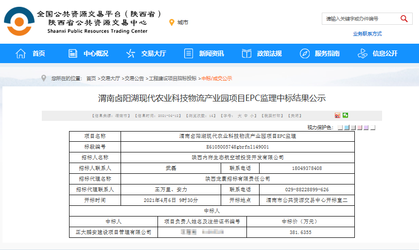 2021年4月6日,正大鵬安建設項目管理有限公司參與了“渭南鹵陽湖現代農業(yè)科技物流產業(yè)園項目EPC監(jiān)理”投標,經評標小組評審,招標人陜西內府生態(tài)航空城投資開發(fā)有限公司確認,正大鵬安建設項目管理有限公司中標。