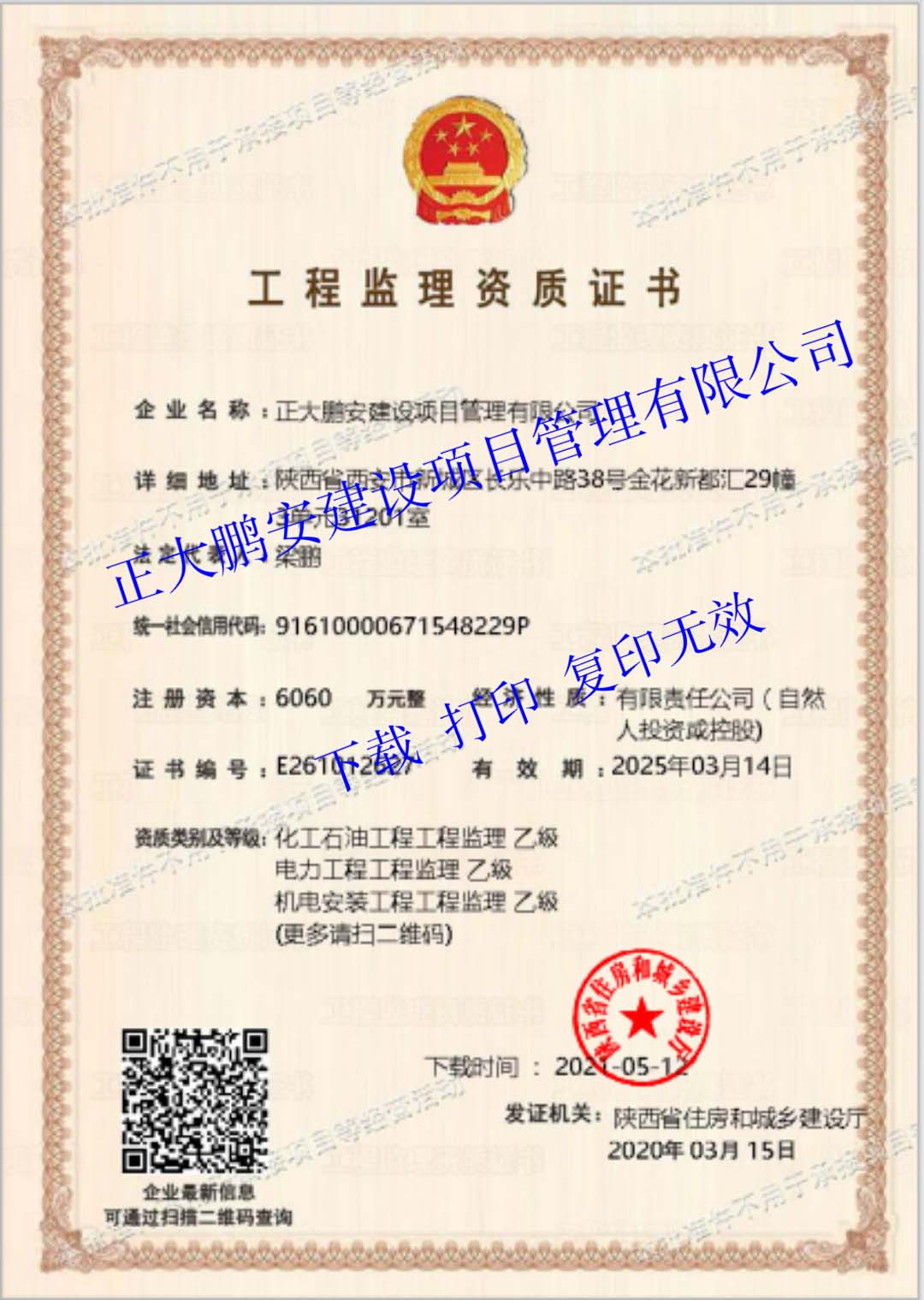 正大鵬安取得化工石油工程監(jiān)理乙級(jí)資質(zhì)、電力工程監(jiān)理乙級(jí)資質(zhì)、機(jī)電安裝工程監(jiān)理乙級(jí)資質(zhì)