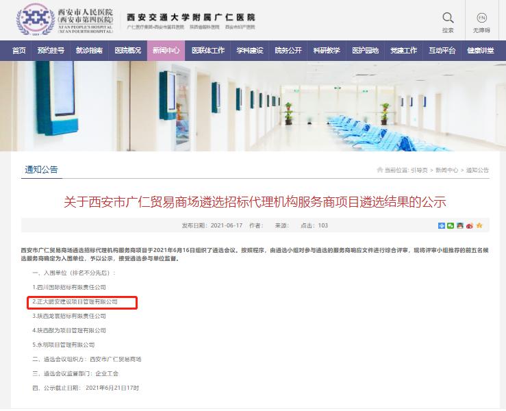 近日,我公司參與了“西安市廣仁貿(mào)易商場遴選招標(biāo)代理機(jī)構(gòu)服務(wù)商項(xiàng)目”,按照程序,由遴選小組對參與遴選的服務(wù)商響應(yīng)文件進(jìn)行綜合評審,最終確定正大鵬安公司為本項(xiàng)目的推薦遴選代理機(jī)構(gòu)。