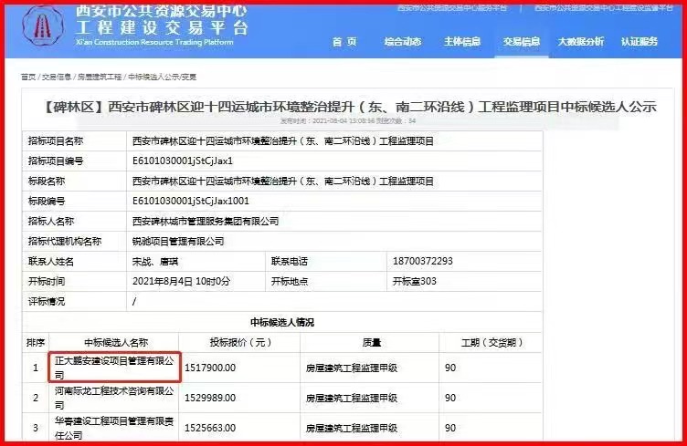 2021年8月,經(jīng)評標委員會評定,招標人確認,正大鵬安建設(shè)項目管理有限公司中標西安碑林城市管理服務(wù)集團有限公司的“西安市碑林區(qū)迎十四運城市環(huán)境整治提升(東、南二環(huán)沿線)工程監(jiān)理”項目。