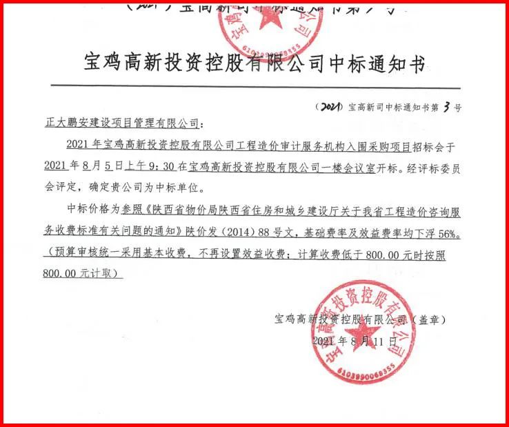 近日,我公司參與了“2021年寶雞高新投資控股有限公司工程造價審計服務機構入圍采購項目”,經(jīng)評標委員會綜合評審,招標人確認,正大鵬安建設項目管理有限公司為中標人。