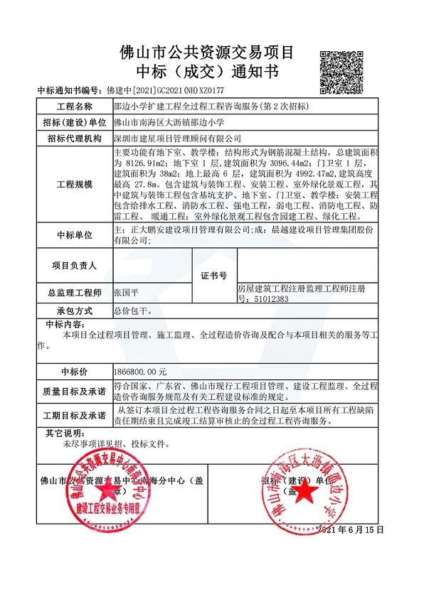 正大鵬安中標(biāo)佛山市南海區(qū)大瀝鎮(zhèn)邵邊小學(xué)擴(kuò)建工程全過(guò)程工程咨詢服務(wù)