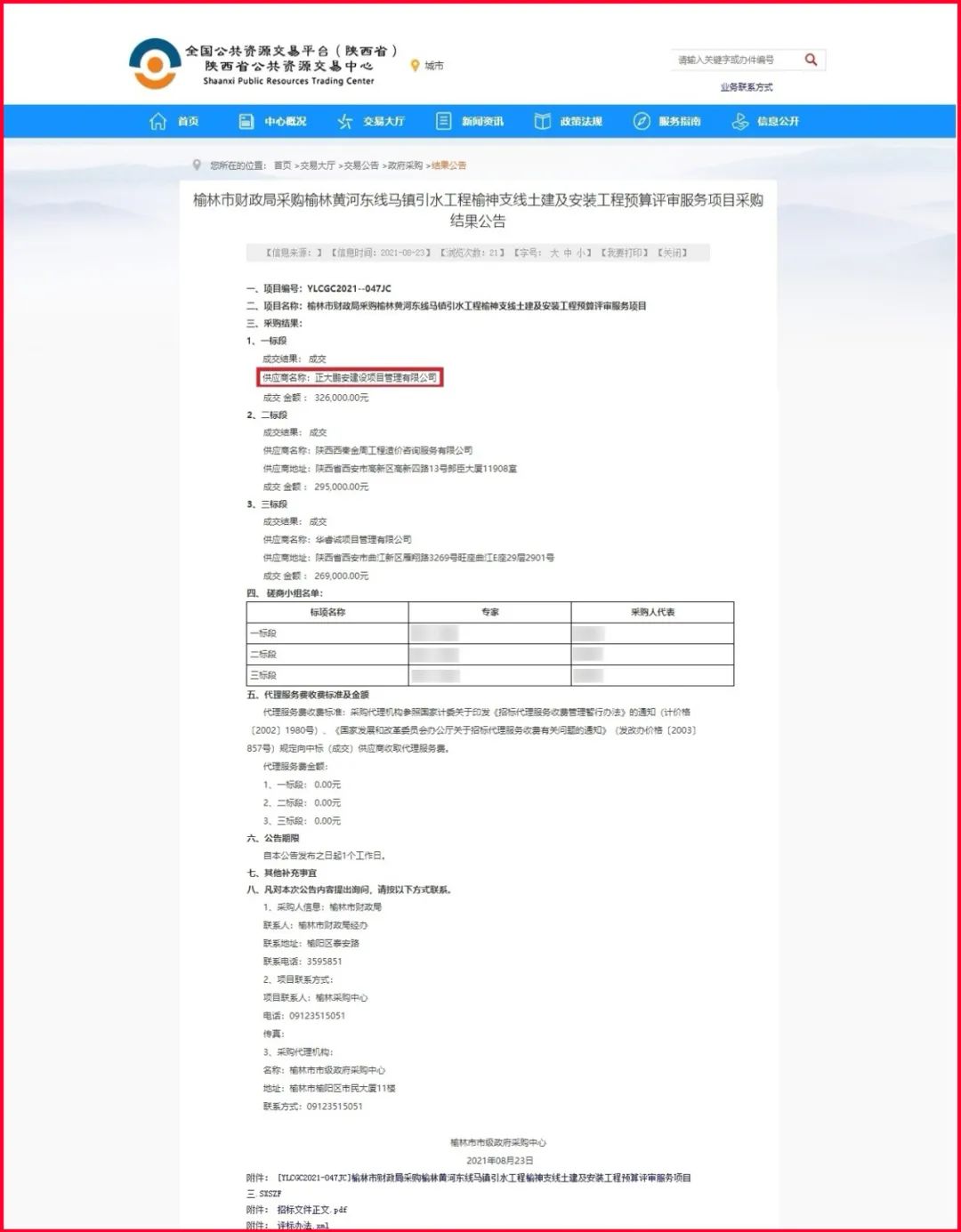 正大鵬安中標榆林市財政局采購榆林黃河東線馬鎮(zhèn)引水工程榆神支線土建及安裝工程預算評審服務項目一標段