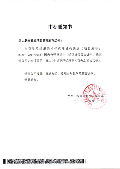2021年8月,我公司參與了“空軍工程大學(xué)航空工程學(xué)院招標(biāo)代理機(jī)構(gòu)遴選項(xiàng)目”,經(jīng)評(píng)標(biāo)委員會(huì)評(píng)審,確定正大鵬安建設(shè)項(xiàng)目管理有限公司為中標(biāo)人。