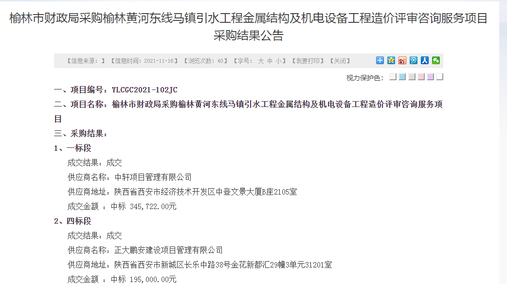 正大鵬安中標榆林市財政局采購榆林黃河東線馬鎮(zhèn)引水工程金屬結構及機電設備工程造價評審咨詢服務項目四標段