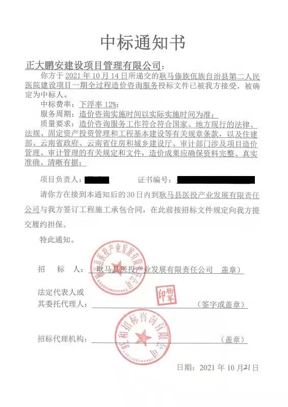 近日,我公司參與了“耿馬傣族佤族自治縣第二人民醫(yī)院建設(shè)項(xiàng)目一期全過程造價(jià)咨詢服務(wù)項(xiàng)目”,經(jīng)評標(biāo)委員會綜合評審,招標(biāo)人確認(rèn),正大鵬安建設(shè)項(xiàng)目管理有限公司為中標(biāo)人。