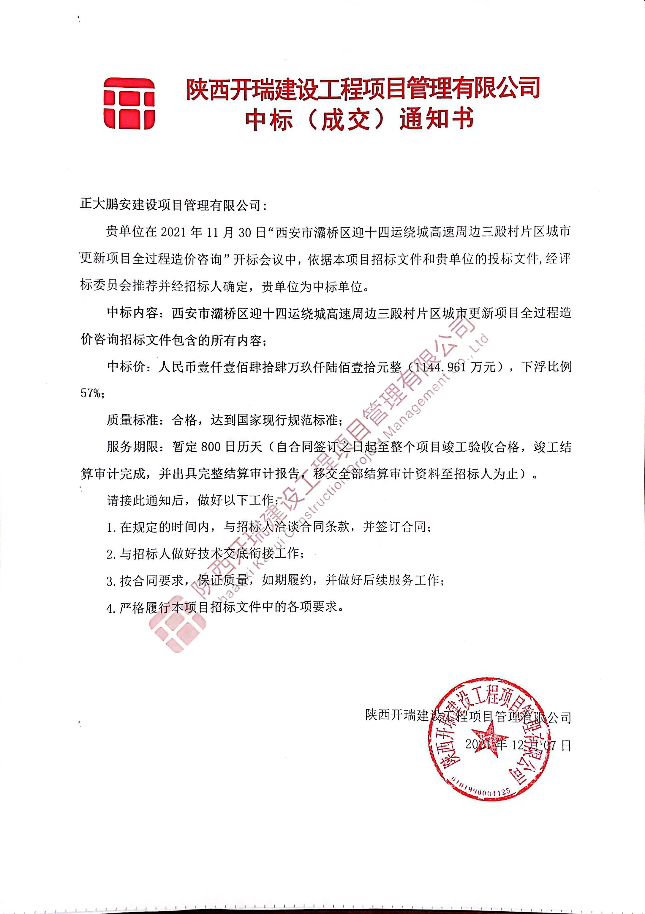 近日,西安市灞橋區(qū)城鎮(zhèn)建設(shè)開發(fā)有限公司對“西安市灞橋區(qū)迎十四運(yùn)繞城高速周邊三殿村片區(qū)城市更新項(xiàng)目全過程造價(jià)咨詢”進(jìn)行公開招標(biāo),經(jīng)評標(biāo)委員會(huì)綜合評審,招標(biāo)人確認(rèn),正大鵬安建設(shè)項(xiàng)目管理有限公司中標(biāo)第1包。