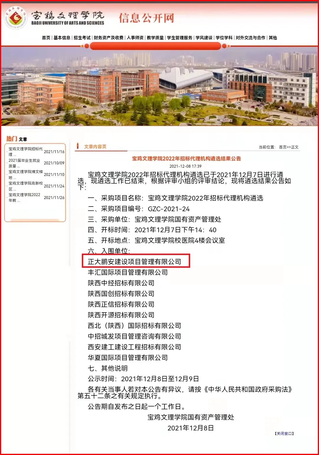 正大鵬安入圍寶雞文理學院2022年招標代理機構(gòu)遴選項目