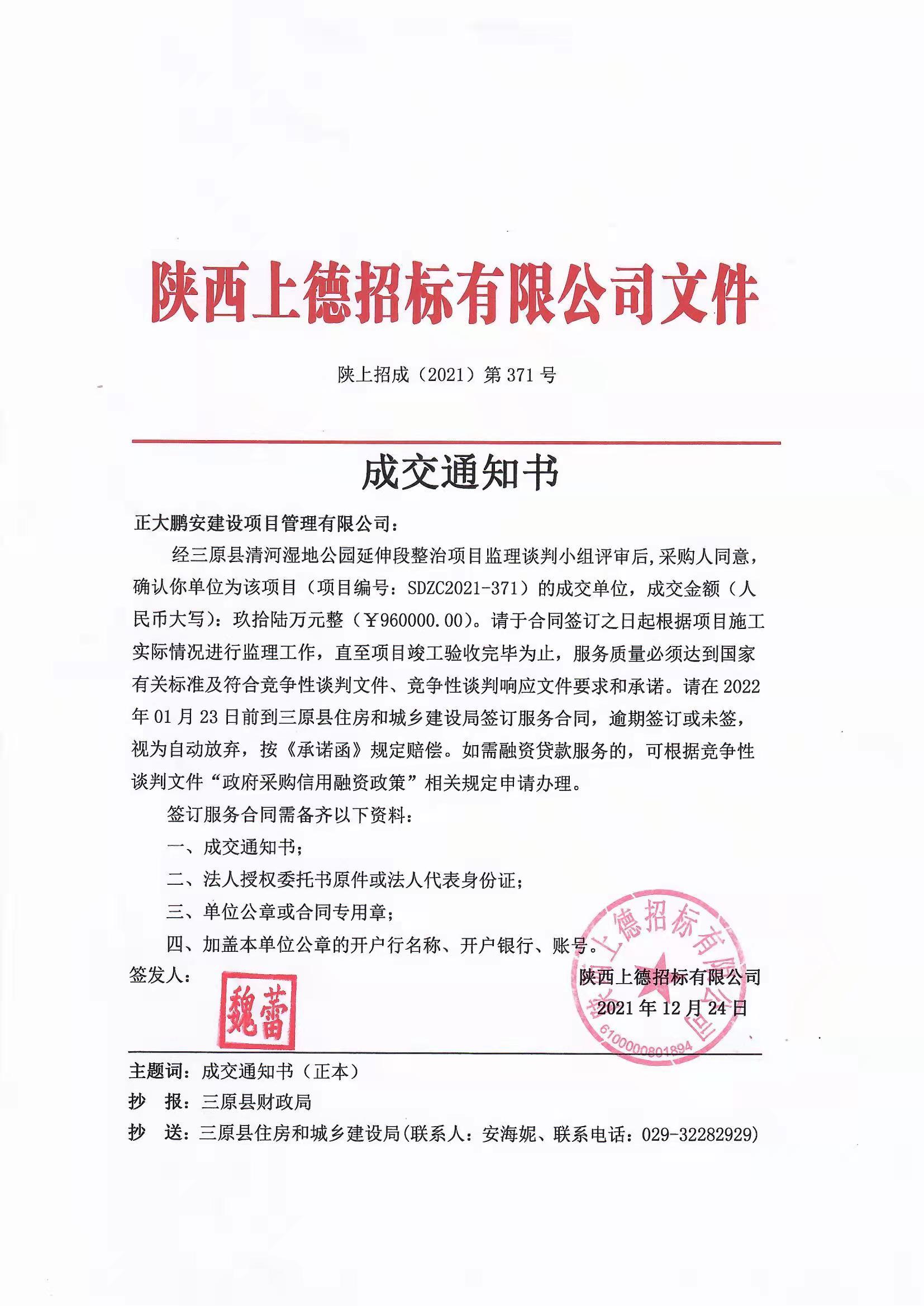 2021年12月,經(jīng)評標委員會評定,招標人確認,正大鵬安建設項目管理有限公司中標"三原縣清河濕地公園延伸整治項目"