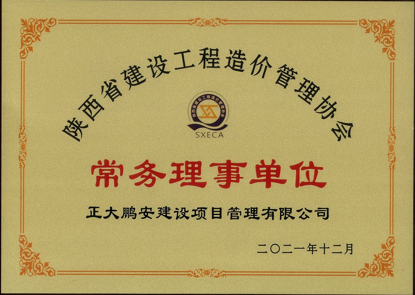 2021年9月,經(jīng)陜西省建設(shè)工程造價管理協(xié)會專家委員會評審,正大鵬安建設(shè)項目管理有限公司榮獲“陜西省建設(shè)工程造價管理協(xié)會常務(wù)理事單位”。