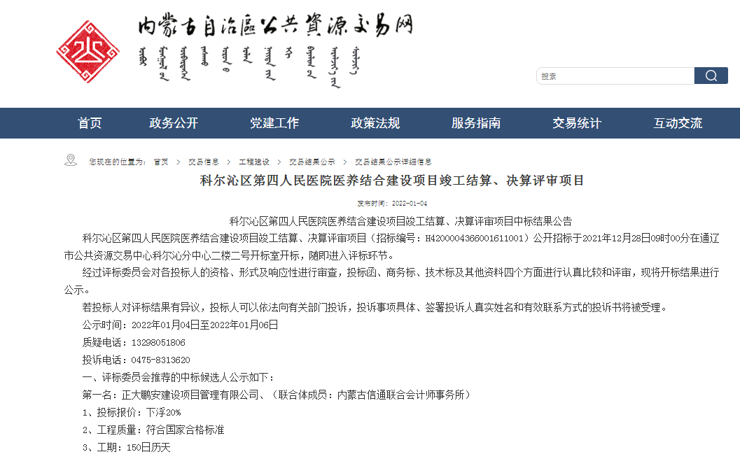 2022年1月,經(jīng)評標委員會評定,招標人確認,正大鵬安建設(shè)項目管理有限公司中標科爾沁區(qū)第四人民醫(yī)院醫(yī)養(yǎng)結(jié)合建設(shè)項目竣工結(jié)算、決算評審項目。