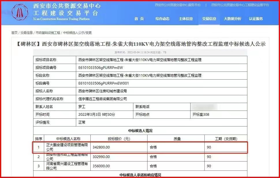 2022年3月,經(jīng)評(píng)標(biāo)委員會(huì)評(píng)定,招標(biāo)人確認(rèn),正大鵬安建設(shè)項(xiàng)目管理有限公司中標(biāo)西安市碑林區(qū)住房和城鄉(xiāng)建設(shè)局的“西安市碑林區(qū)架空線(xiàn)落地工程-朱雀大街110KV電力架空線(xiàn)落地管溝整改工程監(jiān)理”項(xiàng)目。