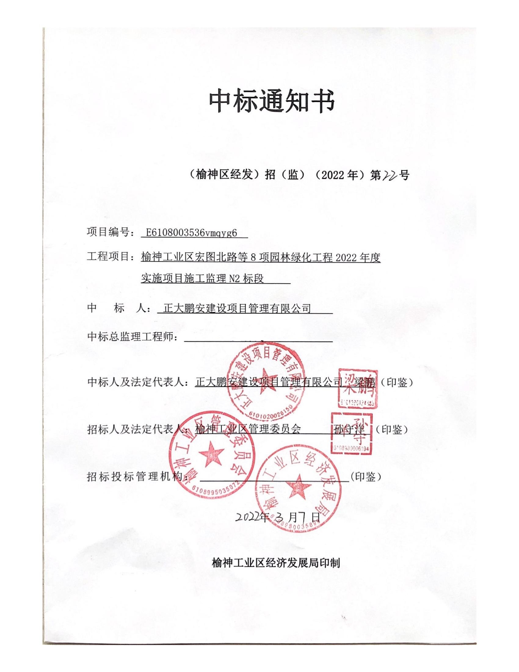 2022年3月,經(jīng)評標(biāo)委員會綜合評審,招標(biāo)確認(rèn),正大鵬安建設(shè)項目管理有限公司中標(biāo)榆神工業(yè)區(qū)管理委員會"榆神工業(yè)區(qū)宏圖北路等8項園林綠化工程2022年度實施項目施工監(jiān)理N2標(biāo)段"