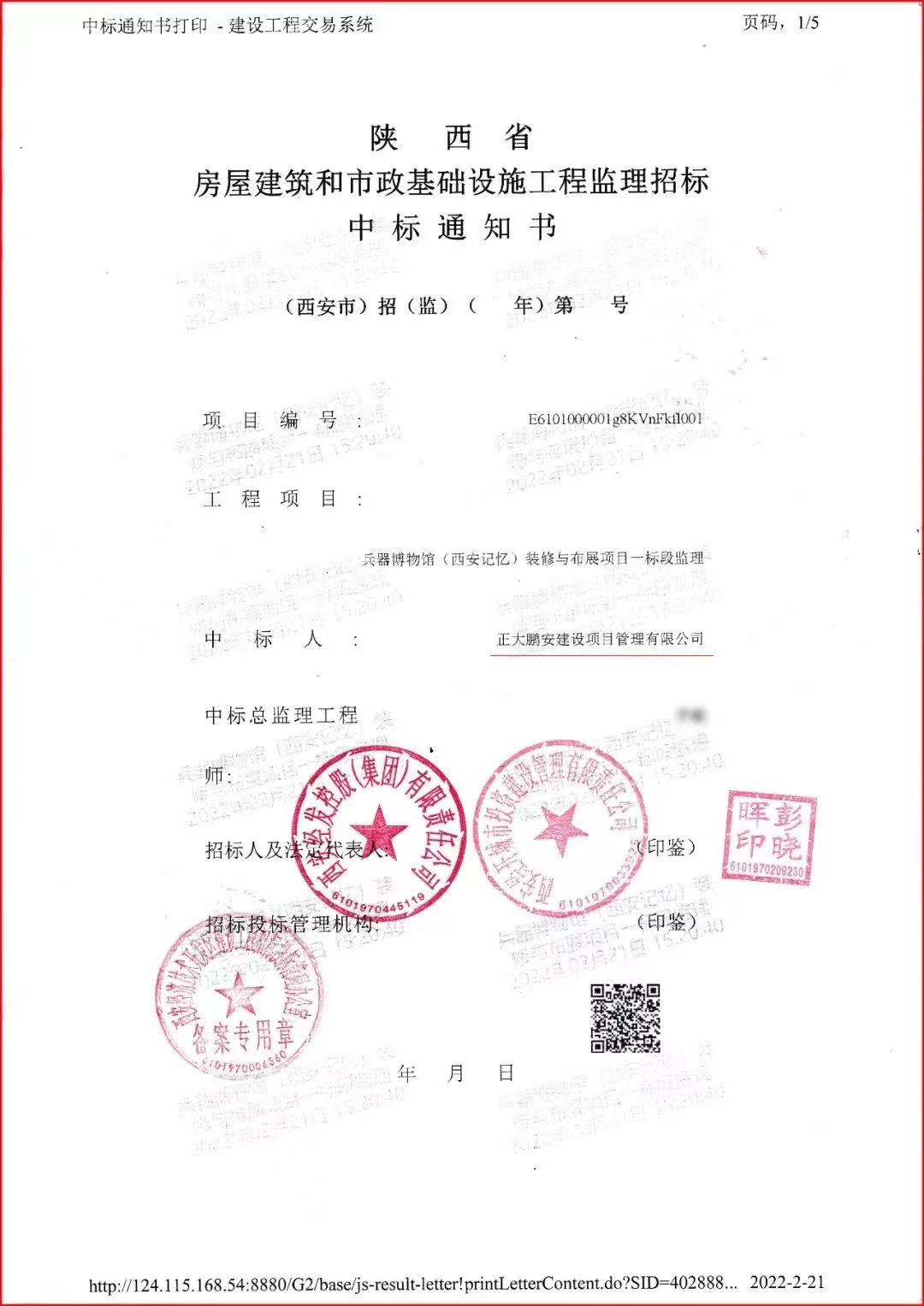2022年3月,經(jīng)評標(biāo)委員會(huì)評定,招標(biāo)人確認(rèn),正大鵬安建設(shè)項(xiàng)目管理有限公司中標(biāo)西安經(jīng)發(fā)控股(集團(tuán))有限責(zé)任公司的“兵器博物館(西安記憶)裝修于布展項(xiàng)目一標(biāo)段監(jiān)理”項(xiàng)目。
