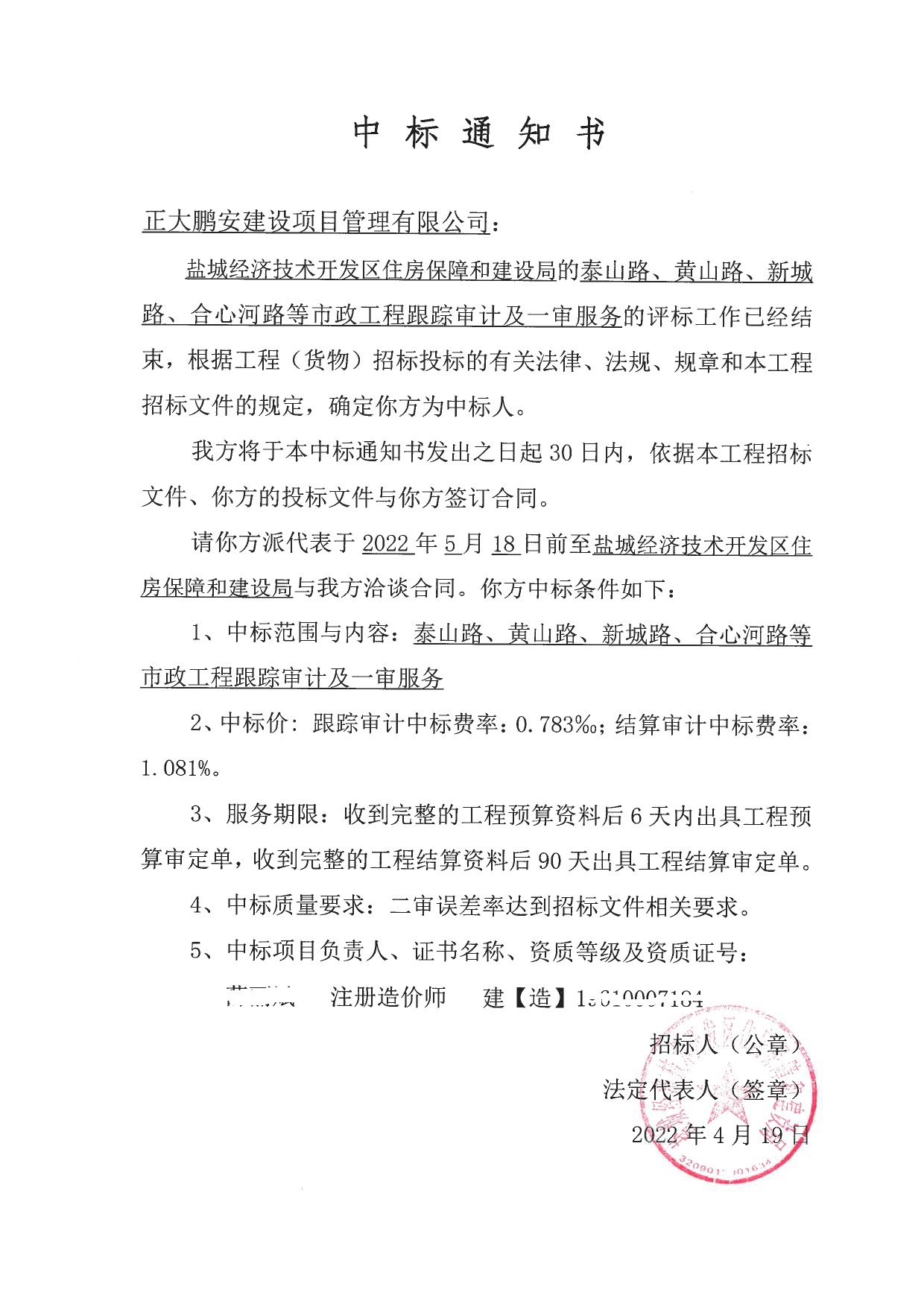 2022年4月,經(jīng)評標(biāo)委員會評定,招標(biāo)人確認(rèn),正大鵬安建設(shè)項目管理有限公司中標(biāo)“泰山路、黃山路、新城路、合心河路等市政工程跟蹤審計及一審服務(wù)項目”。