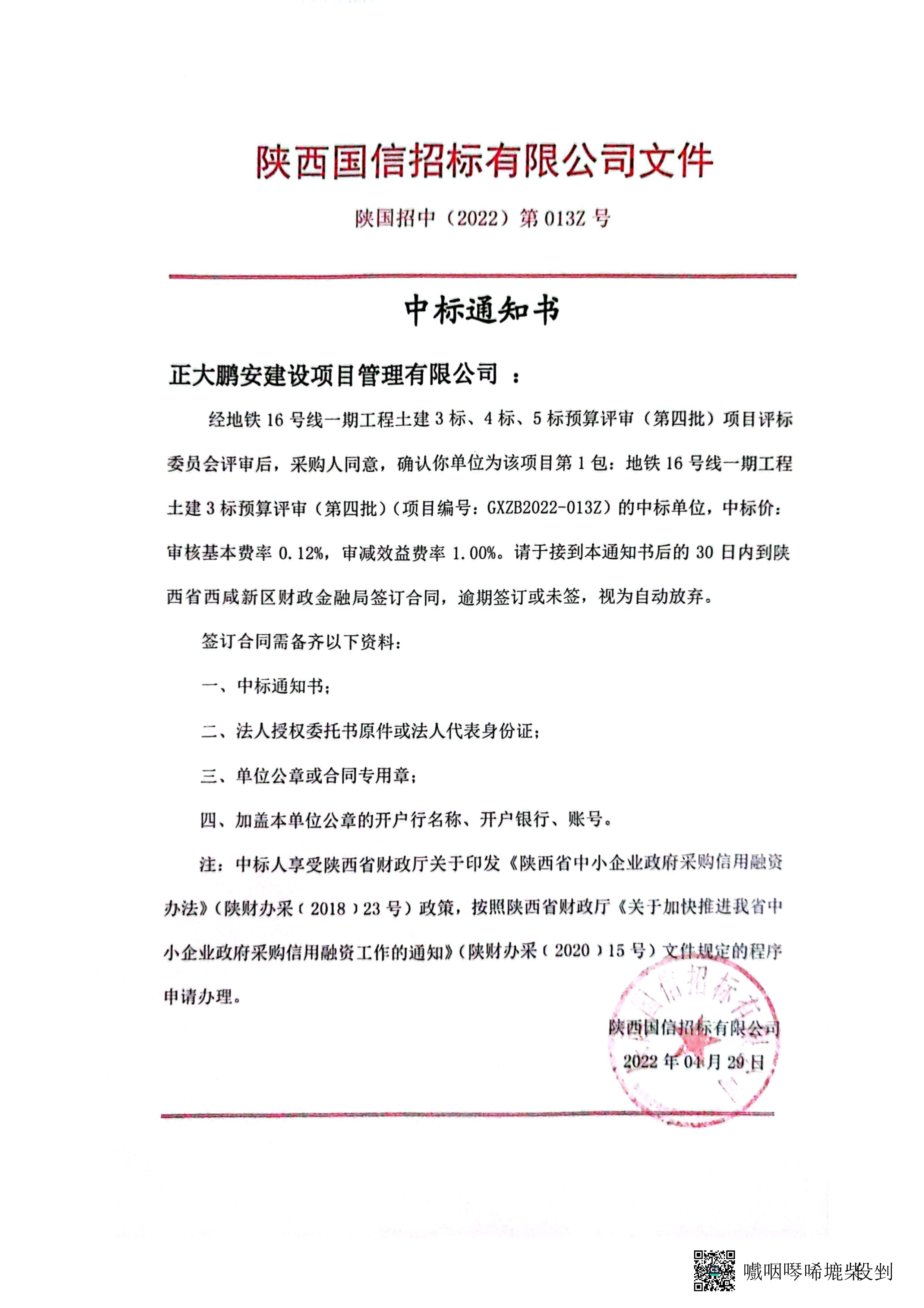 近日,陜西省西咸新區(qū)財政金融局對“地鐵16號線一期工程土建3標、4標、5標預(yù)算評審(第四批)”進行公開招標,經(jīng)評標委員會綜合評審,招標人確認,正大鵬安建設(shè)項目管理有限公司中標第三標。