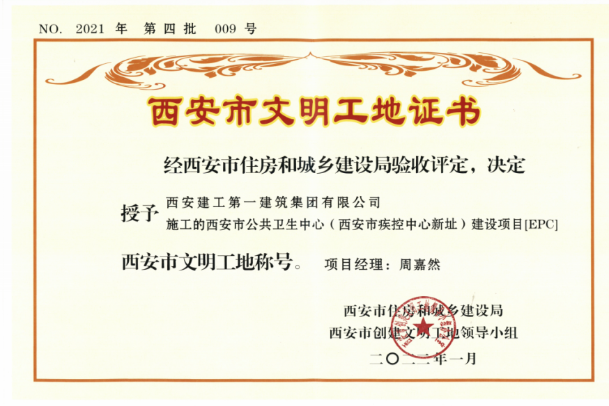 正大鵬安公司監(jiān)理的西安市公共衛(wèi)生中心(西安市疾控中心新址)建設(shè)項(xiàng)目【EPC】監(jiān)理,在西安市2021年第四批文明工地評(píng)選活動(dòng)中,榮獲“西安市文明工地稱號(hào)”。