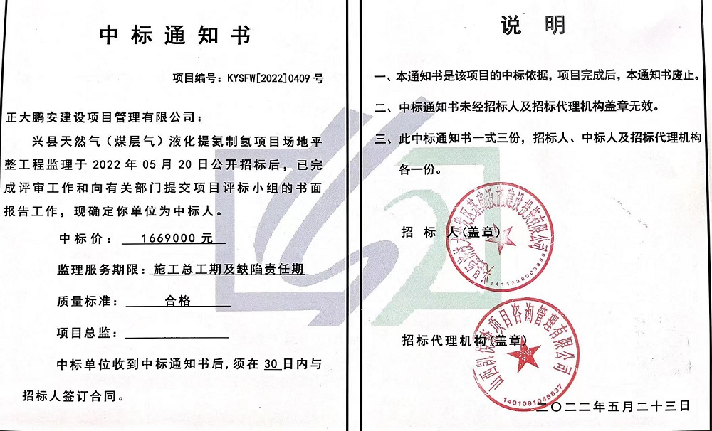 近日,我公司參與”興縣天然氣(煤層氣)液化提氦制氫項(xiàng)目場地平整工程監(jiān)理項(xiàng)目”,經(jīng)評審委員會綜合評審,招標(biāo)人確認(rèn),正大鵬安公司中標(biāo)。