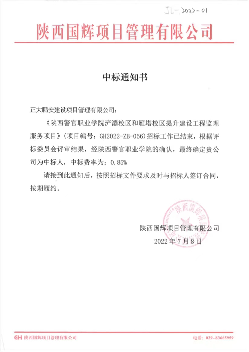 2022年7月,經(jīng)評標(biāo)委員會評定,招標(biāo)人確認(rèn),正大鵬安建設(shè)項(xiàng)目管理有限公司中標(biāo)陜西警官學(xué)院的“陜西警官職業(yè)學(xué)院浐灞校區(qū)和雁塔校區(qū)提升建設(shè)工程監(jiān)理服務(wù)項(xiàng)目”項(xiàng)目。