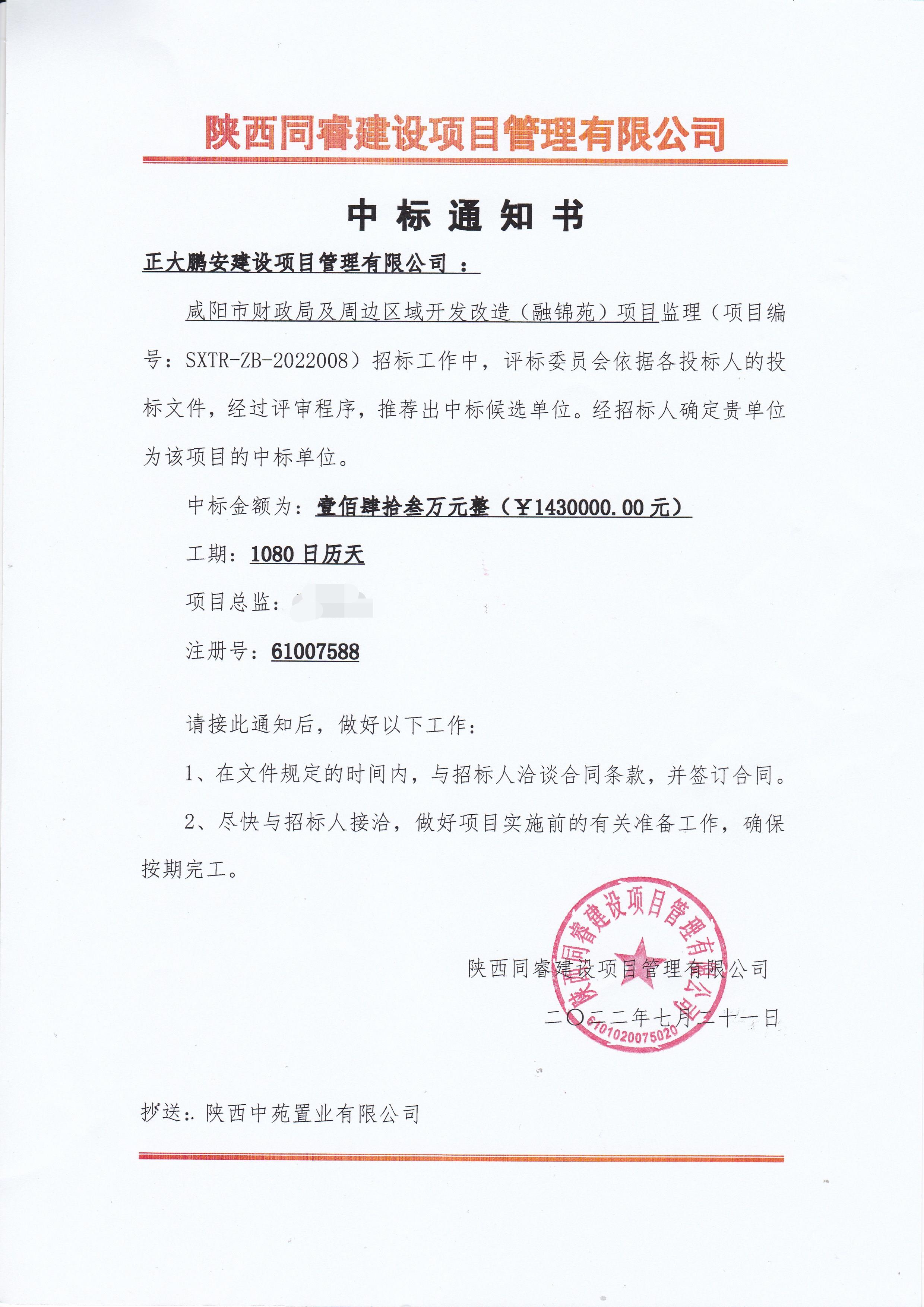 2022年7月,經(jīng)評標委員會評定,招標人確認,正大鵬安建設項目管理有限公司中標陜西中苑置業(yè)有限公司的“咸陽市財政局及周邊區(qū)域開發(fā)改造(融錦苑)項目監(jiān)理”。