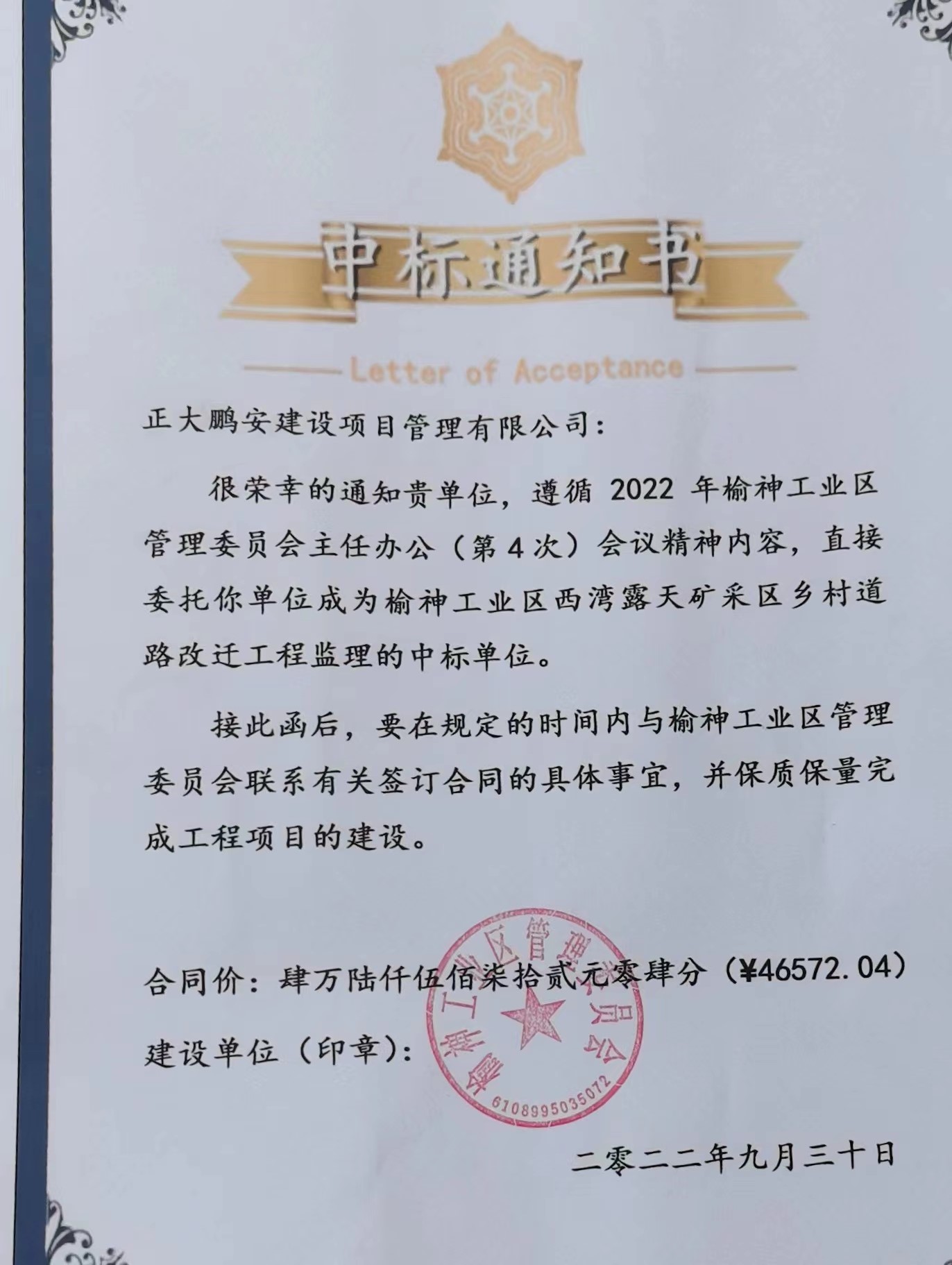 2022年9月,經評標委員會綜合評審,招標確認,正大鵬安建設項目管理有限公司中標榆神工業(yè)區(qū)西灣露天礦采區(qū)鄉(xiāng)村道路改遷工程監(jiān)理項目”
