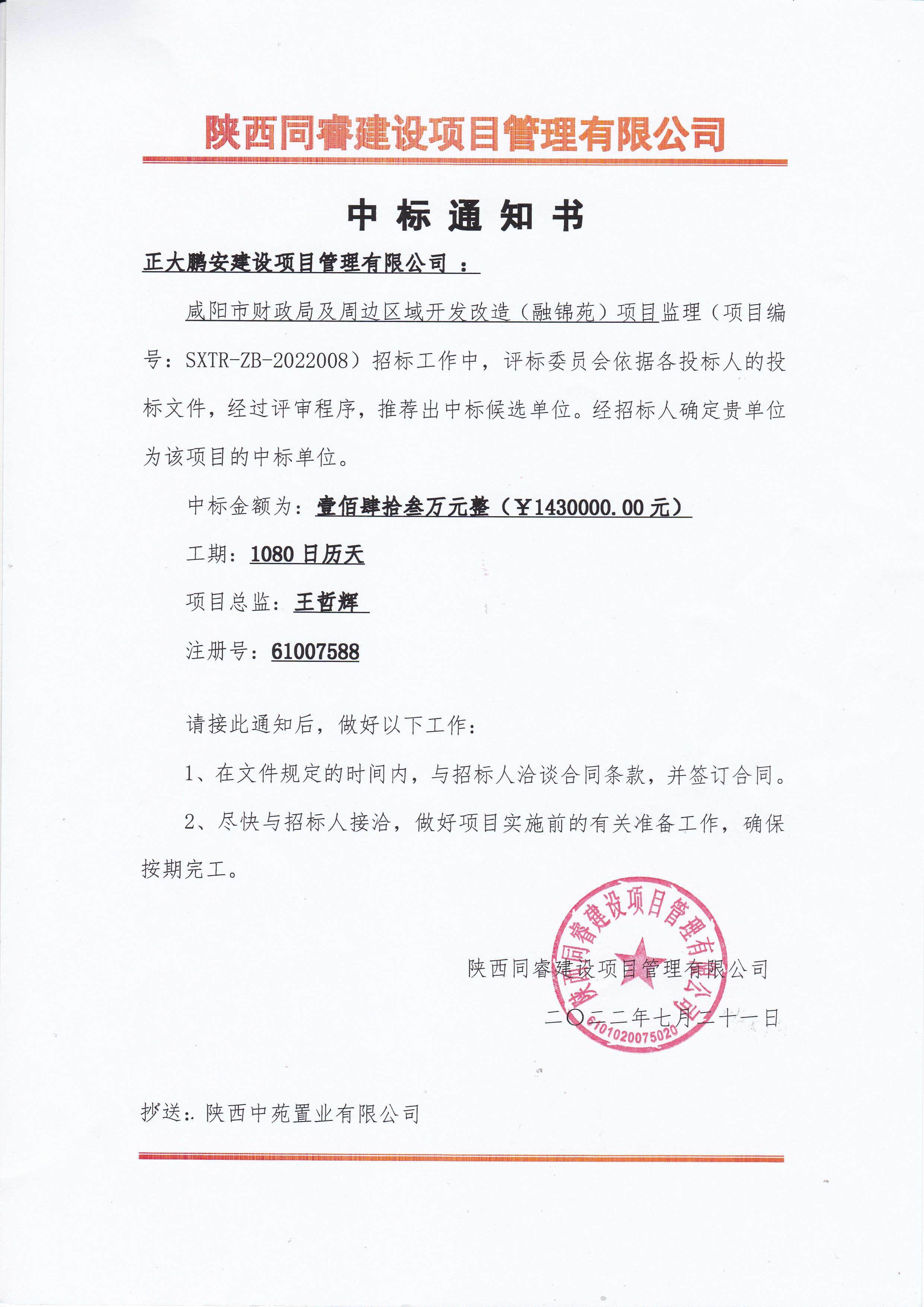 近日,我公司參與”咸陽市財政局及周邊區(qū)域開發(fā)改造項目監(jiān)理”,經(jīng)評審委員會綜合評審,招標(biāo)人確認(rèn),正大鵬安公司中標(biāo)。