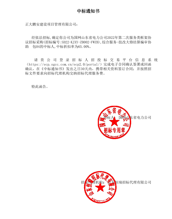 正大鵬安中標(biāo)國網(wǎng)山東省電力公司綜合服務(wù)技改大修編審協(xié)助項(xiàng)目