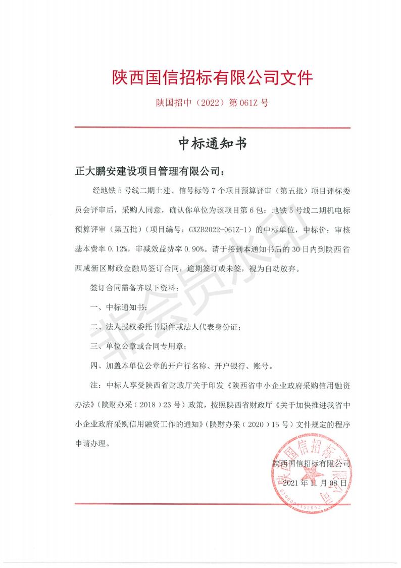 近日,陜西省西咸新區(qū)財(cái)政金融局對(duì)“地鐵5號(hào)線二期土建、信號(hào)標(biāo)等7個(gè)項(xiàng)目預(yù)算評(píng)審(第五批)”進(jìn)行公開(kāi)招標(biāo),經(jīng)評(píng)標(biāo)委員會(huì)綜合評(píng)審,招標(biāo)人確認(rèn),正大鵬安建設(shè)項(xiàng)目管理有限公司中標(biāo)第6包。