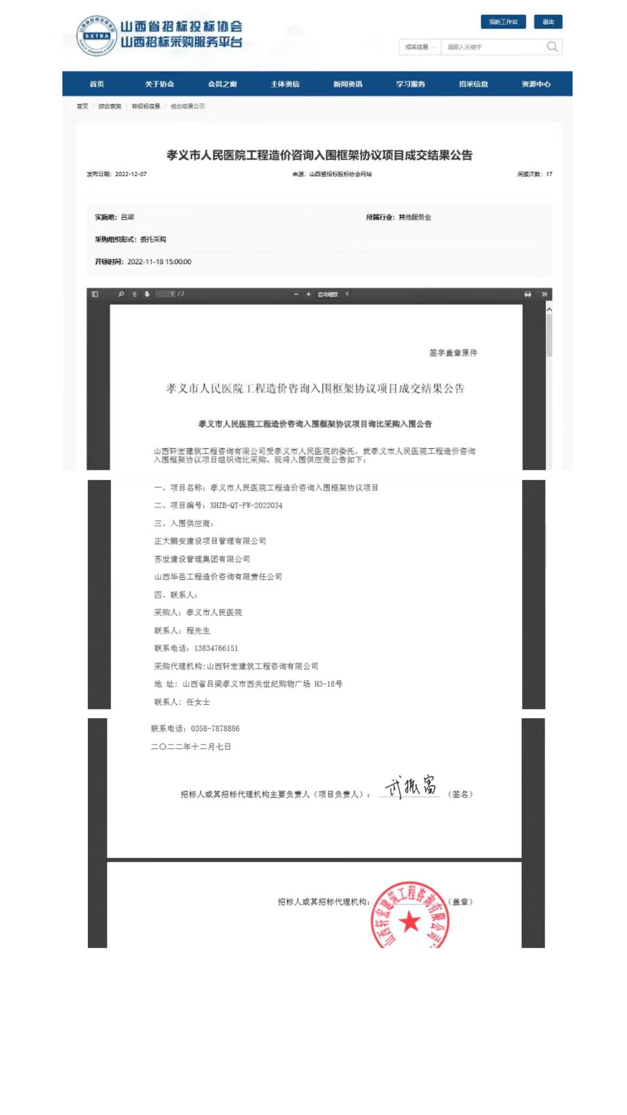 2022年12月,經(jīng)評(píng)標(biāo)委員會(huì)評(píng)定,招標(biāo)人確認(rèn),正大鵬安建設(shè)項(xiàng)目管理有限公司入圍孝義市人民醫(yī)院工程造價(jià)咨詢?nèi)雵蚣軈f(xié)議項(xiàng)目。