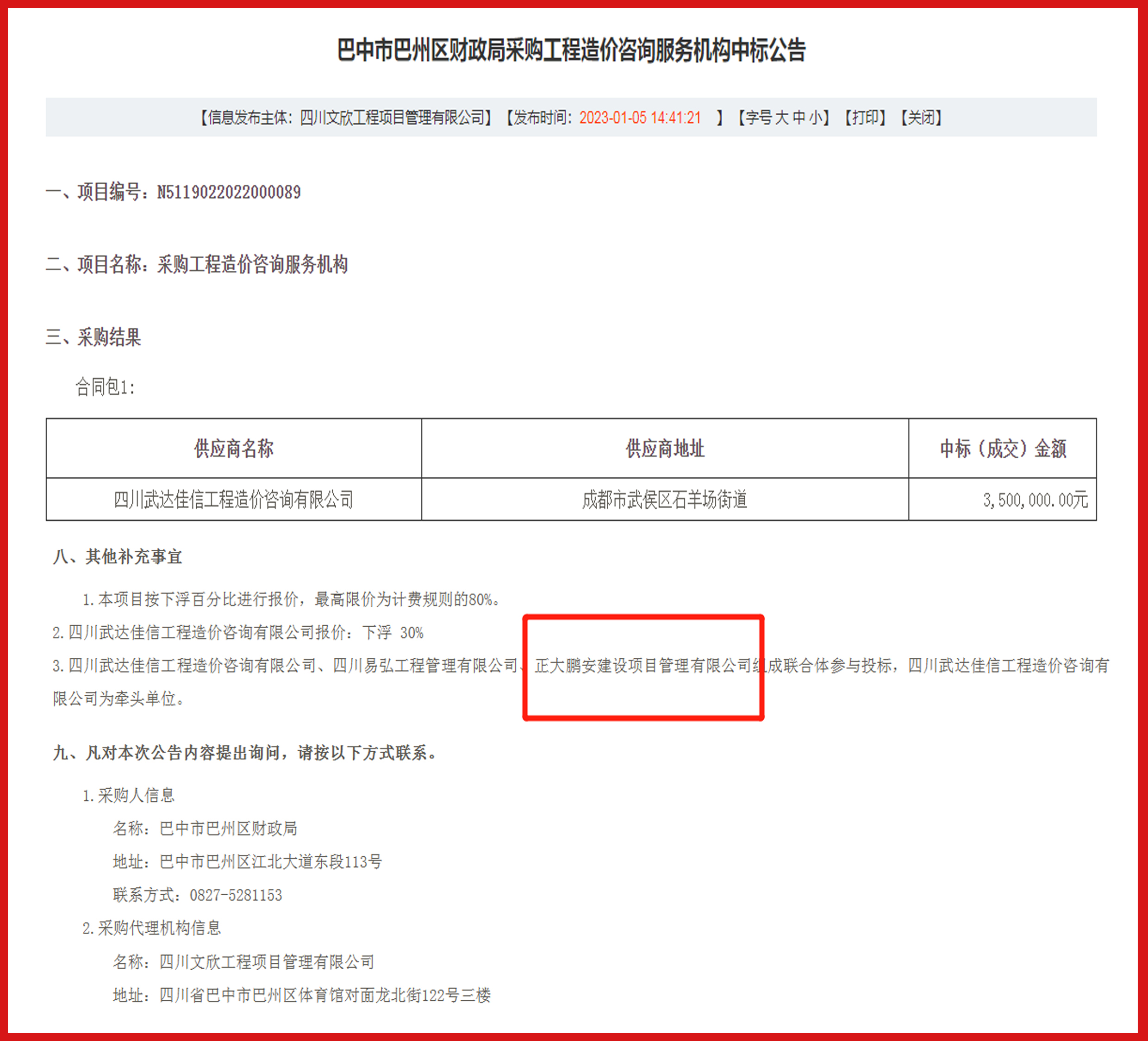 2023年1月,經(jīng)評標(biāo)委員會評定,招標(biāo)人確認(rèn),正大鵬安建設(shè)項目管理有限公司中標(biāo)巴中市巴州區(qū)財政局采購工程造價咨詢服務(wù)機構(gòu)項目。