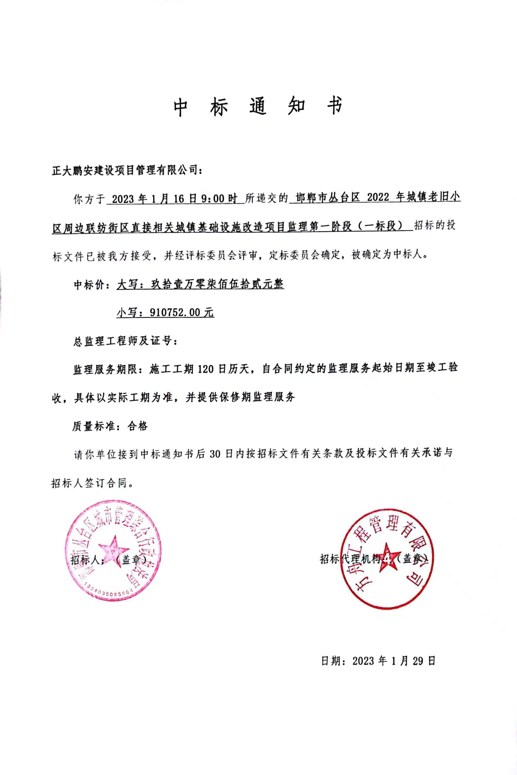 2023年1月,經(jīng)評標委員會評定,招標人確認,正大鵬安建設(shè)項目管理有限公司中標“邯鄲市叢臺區(qū) 2022 年城鎮(zhèn)老舊小區(qū)周邊聯(lián)紡街區(qū)直接相關(guān)城鎮(zhèn)基礎(chǔ)設(shè)施改造項目監(jiān)理第一階段(一標段)”。
