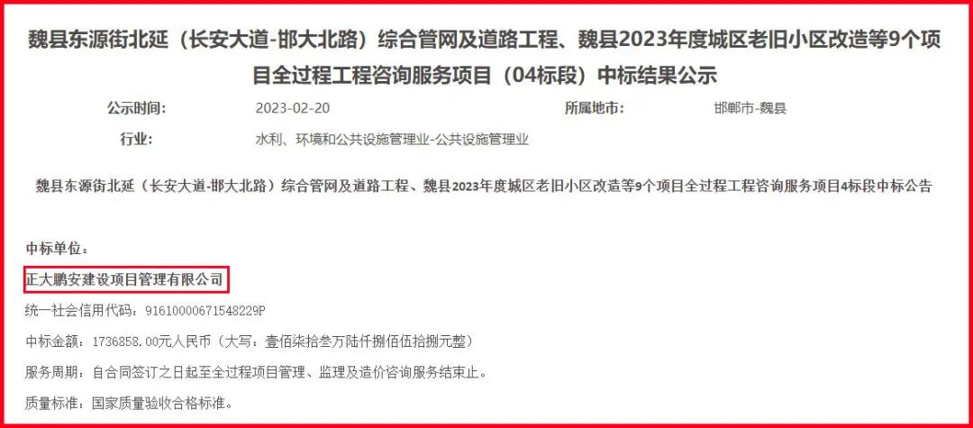 正大鵬安中標(biāo)魏縣東源街北延(長安大道-邯大北路) 綜合管網(wǎng)及道路工程、魏縣 2023 年度城區(qū)老舊小區(qū)改造 等9個(gè)項(xiàng)目 全過程工程咨詢管理服務(wù)項(xiàng)目04標(biāo)