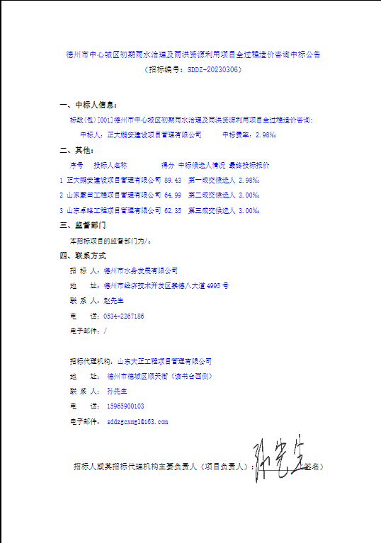 2023年3月,經評標委員會評定,招標人確認,正大鵬安建設項目管理有限公司中標德州市中心城區(qū)初期雨水治理及雨洪資源利用項目全過程造價咨詢項目。