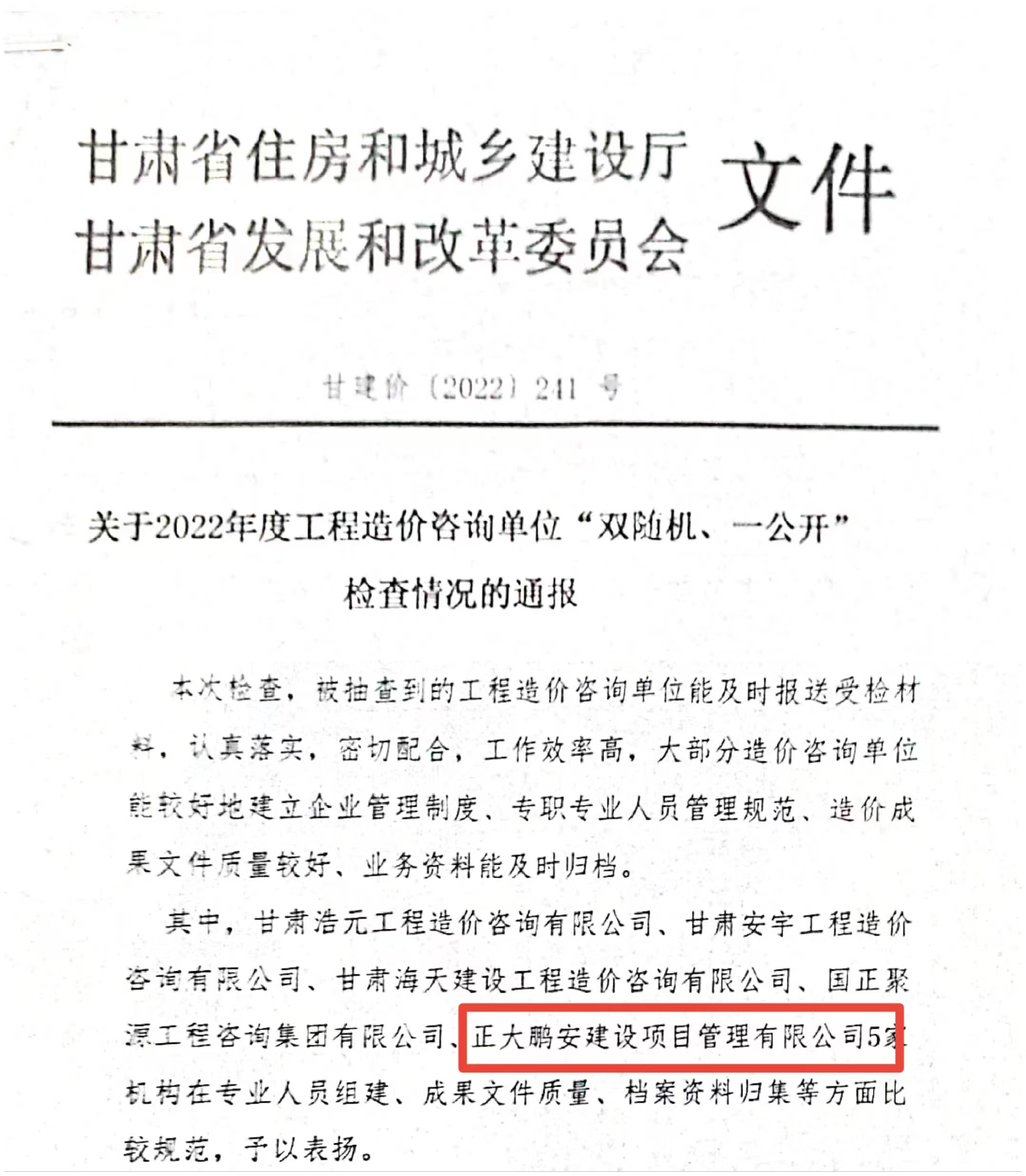 正大鵬安公司榮獲甘肅省住建局、發(fā)改委的通報(bào)表?yè)P(yáng)
