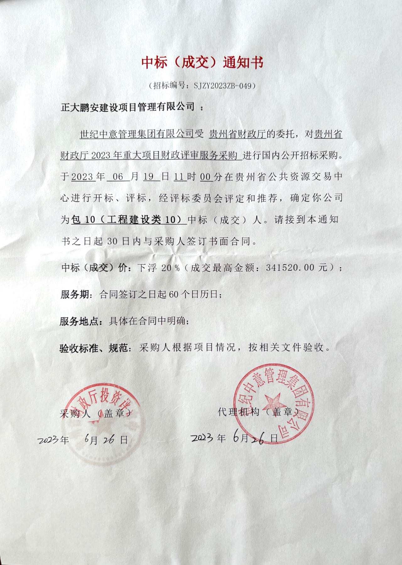 2023年6月,經(jīng)評標委員會綜合評審,招標人確認,正大鵬安建設(shè)項目管理有限公司中標“貴州省財政廳2023年重大項目財政評審服務(wù)采購包10(工程建設(shè)類10)”