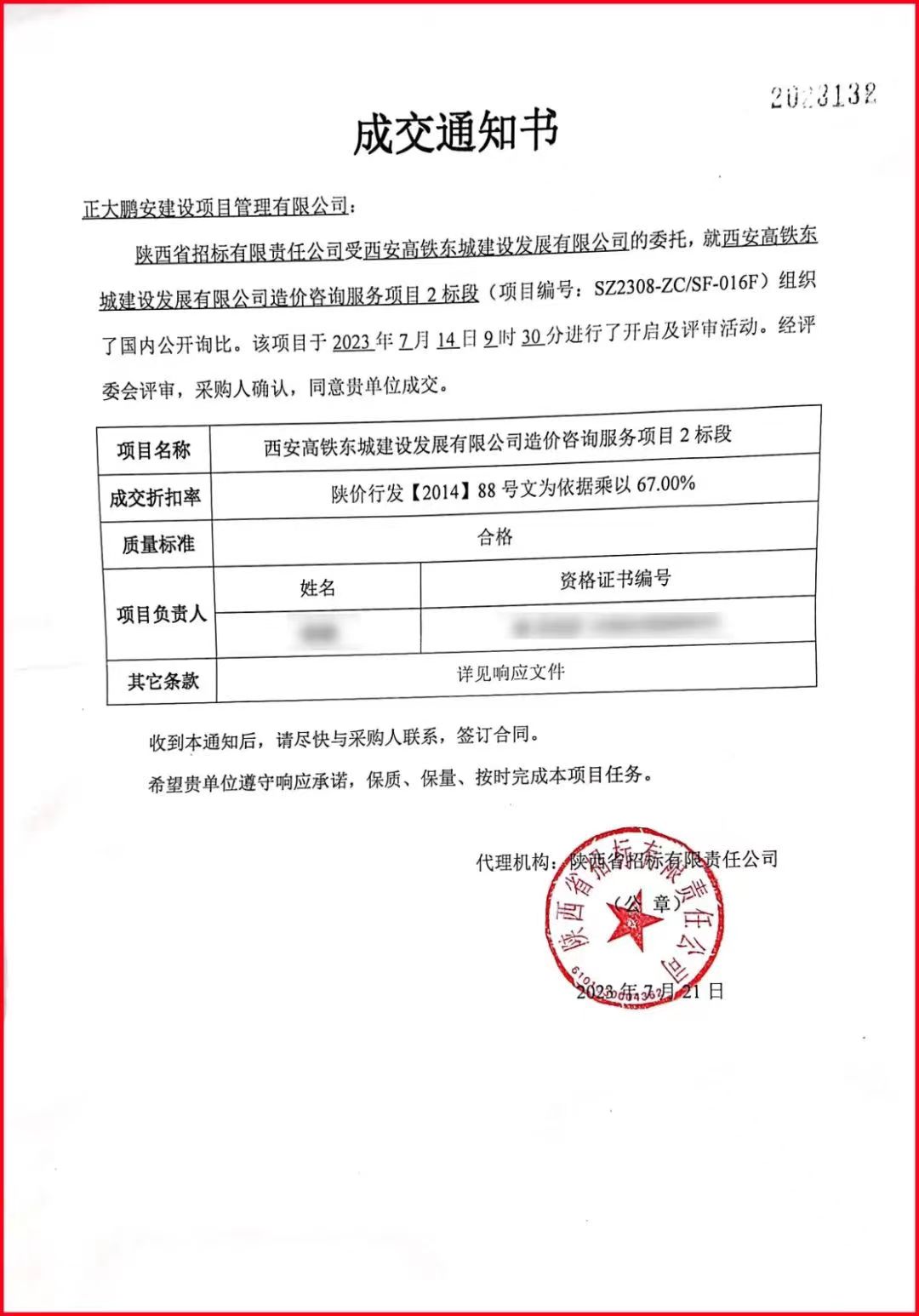 2023年7月,經(jīng)評(píng)標(biāo)委員會(huì)評(píng)定,招標(biāo)人確認(rèn),正大鵬安建設(shè)項(xiàng)目管理有限公司中標(biāo)西安高鐵東城建設(shè)發(fā)展有限公司造價(jià)咨詢(xún)服務(wù)項(xiàng)目2標(biāo)段。