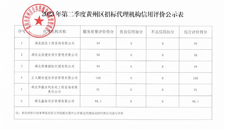 2023年7月,經(jīng)黃岡市黃州區(qū)公共資源交易監(jiān)督管理局評(píng)定,正大鵬安建設(shè)項(xiàng)目管理有限公司榮獲2023年第二季度黃州區(qū)招標(biāo)代理機(jī)構(gòu)信用評(píng)價(jià)優(yōu)秀單位。