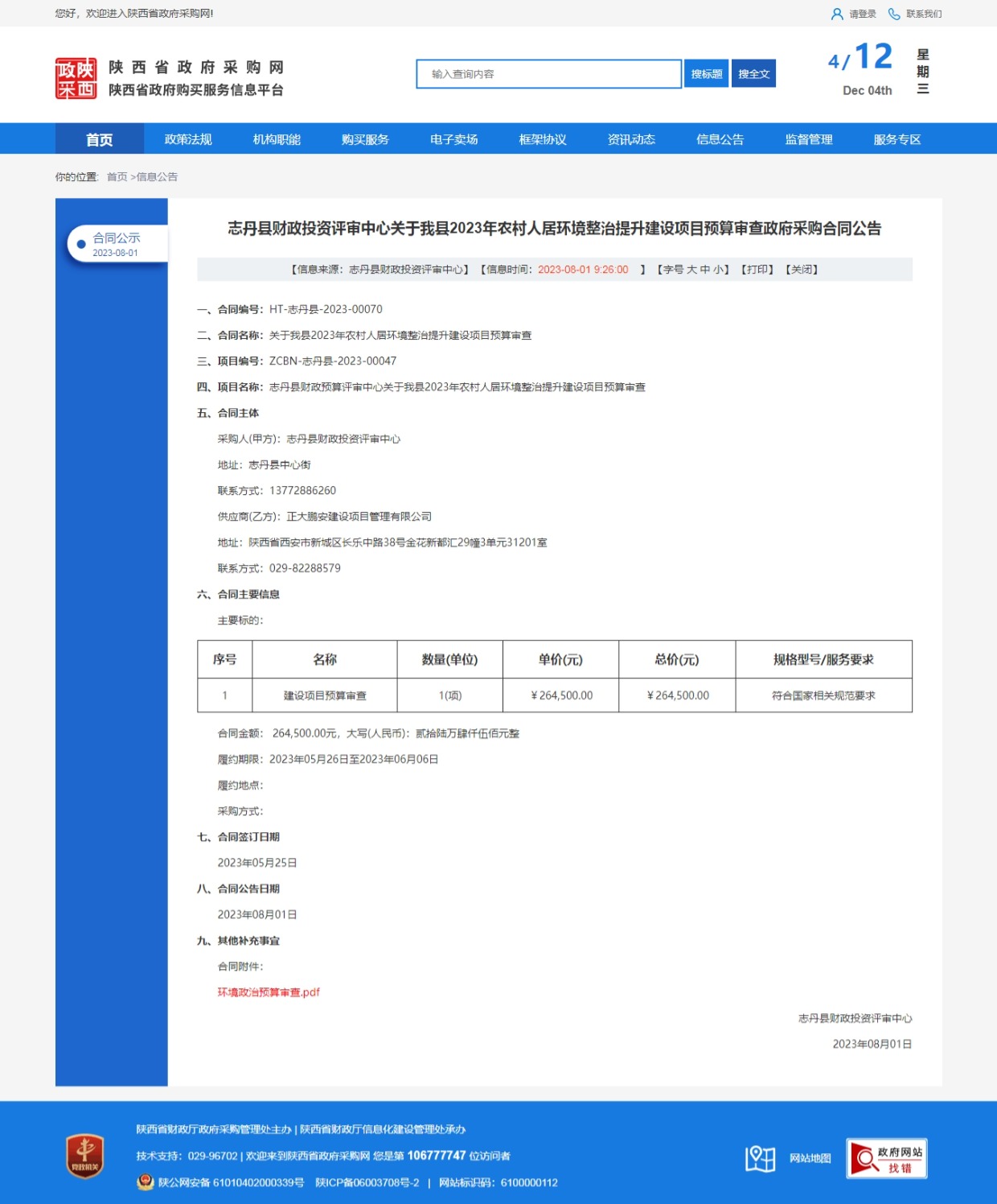 2023年7月31日,經(jīng)評標(biāo)委員會(huì)綜合評審,招標(biāo)人確認(rèn),正大鵬安建設(shè)項(xiàng)目管理有限公司中標(biāo)志丹縣2023年農(nóng)村人居環(huán)境整治提升建設(shè)項(xiàng)目預(yù)算審查政府采購合同。