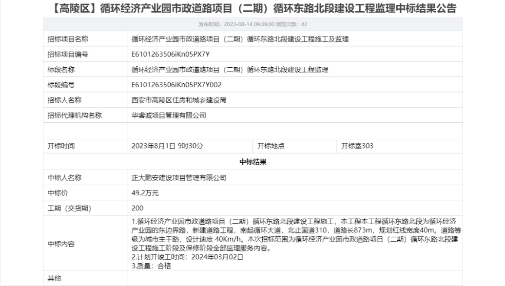 2023年8月,經(jīng)評標委員會評定,招標人確認,正大鵬安建設(shè)項目管理有限公司中標西安市高陵區(qū)住房和城鄉(xiāng)建設(shè)局的“循環(huán)經(jīng)濟產(chǎn)業(yè)園市政道路項目(二期)循環(huán)東路北段建設(shè)工程監(jiān)理”項目。