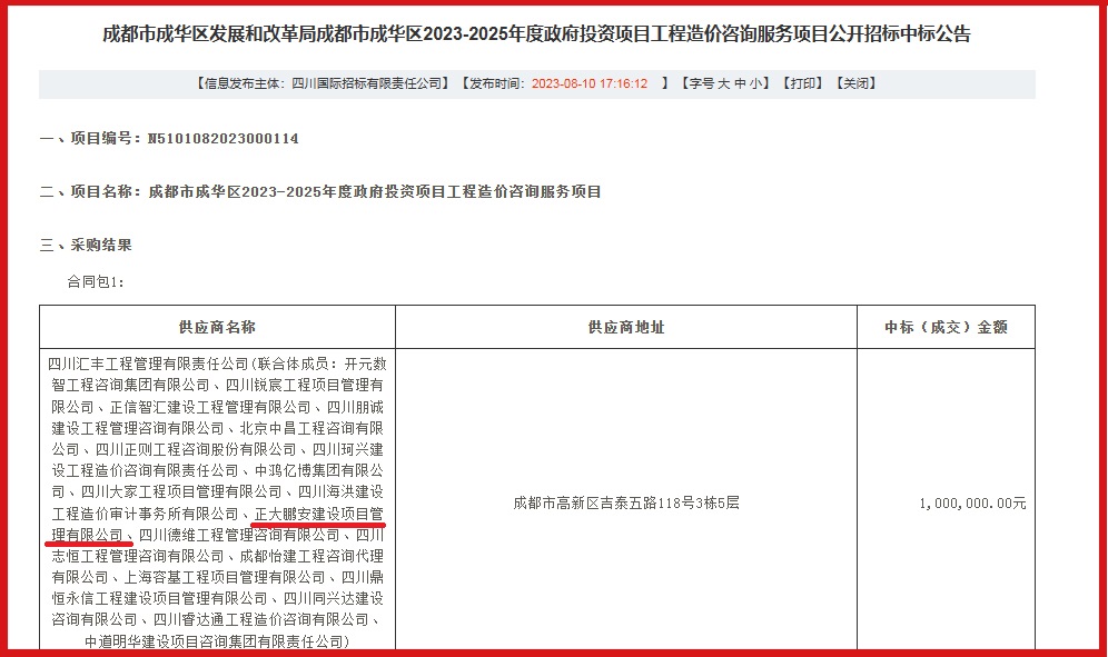 2023年8月,經(jīng)評標委員會評定,招標人確認,正大鵬安建設(shè)項目管理有限公司中標成都市成華區(qū)2023-2025年度政府投資項目。