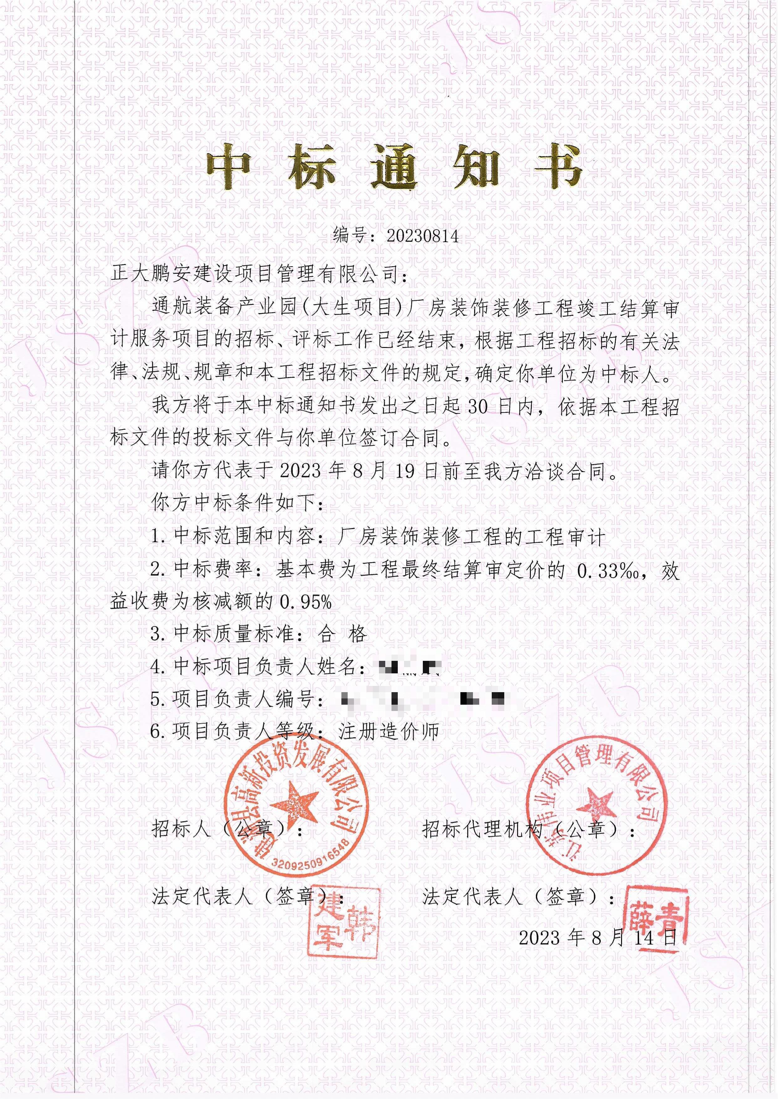 2023年8月,經(jīng)評標(biāo)委員會評定,招標(biāo)人確認,正大鵬安建設(shè)項目管理有限公司中標(biāo)通航裝備產(chǎn)業(yè)園(大生項目)廠房裝飾裝修工程竣工結(jié)算審計服務(wù)項目。