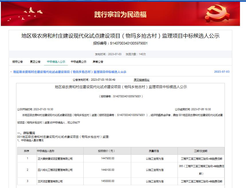 2023年7月,經(jīng)評標委員會評定,招標人確認,正大鵬安建設項目管理有限公司中標改則縣住房和城鄉(xiāng)建設局的“地區(qū)級農(nóng)房和村莊建設現(xiàn)代化試點建設項目(物瑪搶古村)監(jiān)理”項目。