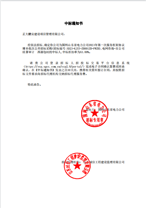 2023年8月,經(jīng)評標(biāo)委員會評定,招標(biāo)人確認(rèn),正大鵬安建設(shè)項目管理有限公司中標(biāo)國網(wǎng)山東省電力公司2023年第一次服務(wù)框架協(xié)議增補(bǔ)批次公開招標(biāo)采購(招標(biāo)編號:SD23-KJXY-ZB001ZB-FWZB),電網(wǎng)咨詢-市公司結(jié)算審計西部包02的中標(biāo)人。