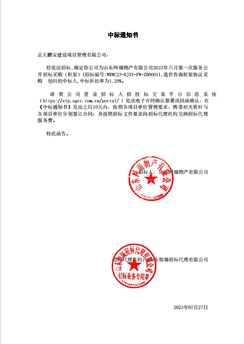 2023年8月,經(jīng)評標委員會評定,招標人確認,正大鵬安建設(shè)項目管理有限公司中標山東網(wǎng)瑞物產(chǎn)有限公司2023年六月第一次服務(wù)公 開招標采購(框架)(招標編號:WRWC23-KJXY-FW-ZB0601),造價咨詢框架協(xié)議采購包01的中標人。